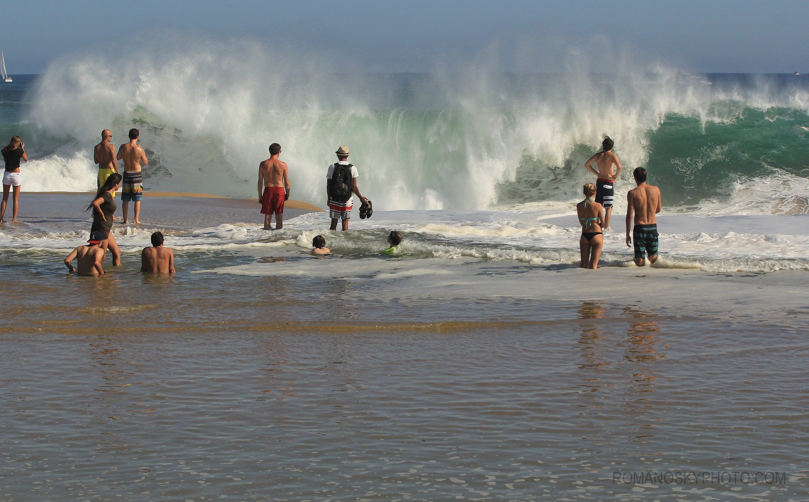 The swell, although not an all-timer, had an inordinate amount of push as the tide filled in on the 6th. The great amount of water constantly refilling the depression behind the berm resulted in the largest pond and “river” many long-time Wedge people have ever witnessed. The rapids had small standing waves that were even rideable on boogies. Everyone, save those who got drenched, lost belongings or got their cameras ruined, enjoyed this face of Wedge.Parker Varner “riding” the sand bar of sand bars.This shot gives a good idea of the swell’s push. The little kids were loving it – hard to imagine their experiences from this day not being etched into their memories for all time.Sean Starky where he likes being.Not a big wave, but a rare right. The lighting and white water dramatize the image some. Rider ?Long time bodysurfers Rick Piani and Craig Plitt standing next to a stretching Sean Starky. These three represent 60 or more years of Wedge experience.The un-rideable? No way. If there’s a camera on the beach or in the water there’s always some willing bloke for some rogueish Wedge thing, damn the consequences (unless they’re suffered, eh?).Thick… nasty… hollow… and rideable. Trick with one like this is catching it where it’s catchable. An added pleasure: not witnessing the clutter of water snappers usually populating and polluting the wave’s fore’water’. Catching the crowd in this shot was intentional.Thomas VanMelum in the middle of what was a smooth spinner. To really appreciate a good spinner it must be seen taking place or in a video. A still photo will not do one justice.The height of this wave breaking in the harbor entrance usually indicates an epic swell seen perhaps once every 3 or 4 years. Accordingly the set waves at Wedge should have exceeded 30 feet in face height (the largest this swell may have been twenty). Note: Photographing such a wave from the Wedge jetty’s rocks, without the people, remains a quest.Yes – SUPers are becoming part of the on-going, ever-changing Wedge story. Thank the Heavens for the Blackball!No caption necessary, though paramedics are occasionally summoned after such beauties.Not an enviable position, eh? Bud Browne would have paid to have caught this wipeout. So Bud, this one’s for you.From the street at sunset 7/6/14: a somewhat familiar scene of emergency and police vehicles congregating at Wedge as the red flag on the guard stand is barely affected by a gentle breeze.