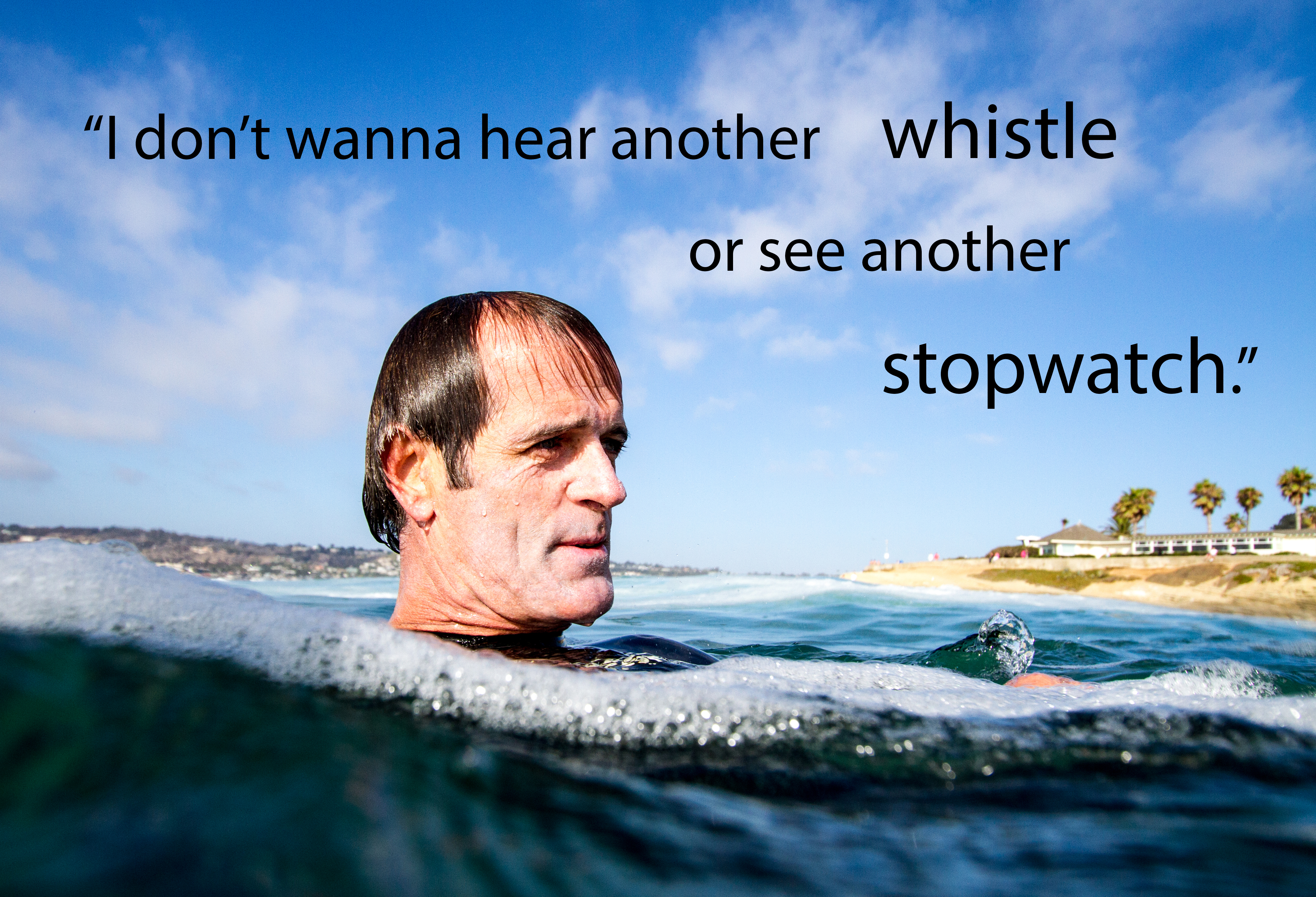 The life of an athlete is structured. Each meal carefully constructed and each beer a challenge to your resolve. For Robin, bodysurfing is a counterbalance to the years of careful calculation. “I don’t want to hear another whistle or see another stopwatch,” he stated with his ever-present grin. Robin speaks warmly of his time as a runner and the camaraderie of running with companions. Due to his slight frame, he earned the name “Wednesday Legs” as in When’s they legs gonna break? Robin still pushes that frame, only now he does it in the water.