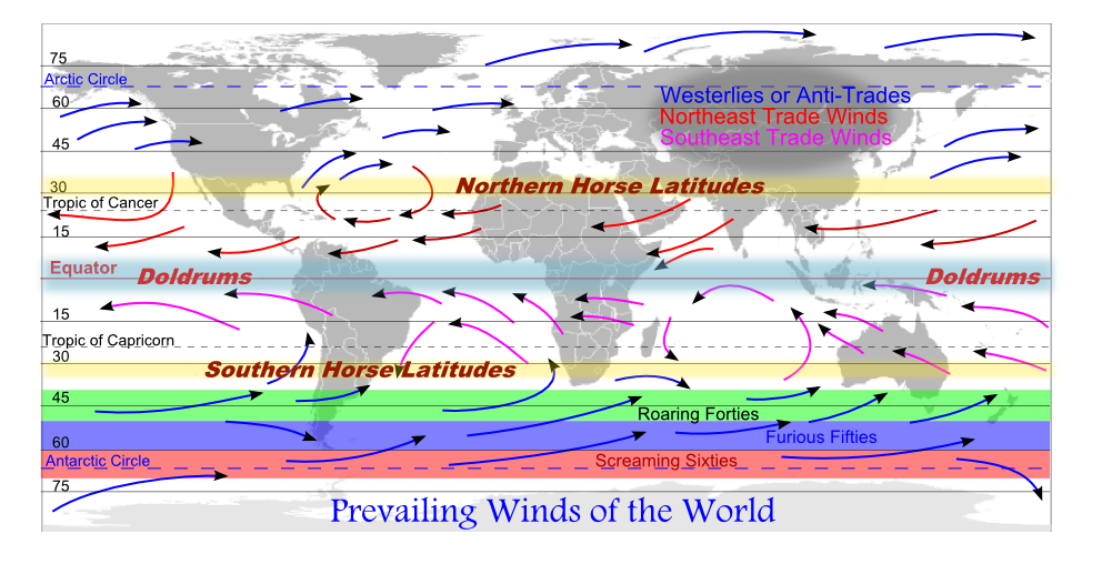 The Roaring Forties refers to the area between 40 and 50 degrees latitude south with the Fifties and Sixties below. Famous for relentless winds, unruly seas and treacherous navigation, this area is unique on our planet because there is very little land. The 60th parallel south passes through nothing but Ocean. Because there is little or no land to slow the flow of air, winds here whip around the globe unimpeded. These winds are aided in their westerly flow by the rotation of the Earth, known as the coriolis effect.