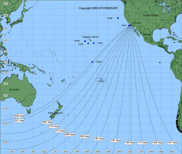 In the Southern Ocean, large lows form below Australia and are driven to the east by the prevailing westerly flow. As these storms move into the South Pacific Ocean (SPAC), they enter the swell window for Hawaii and California. Even though the storms can be enormous, our south swells are generally smaller and less consistent than our winter time west and northwest swells. Because south swells travel between 4,000 to 7,000 miles to reach our shores, their energy decays and becomes less consistent. While our winter swells only travel 500 to 3,000 miles with much less deterioration. Because of their long range travel, significant south swells approach our coast with very long periods in excess of 20 seconds.