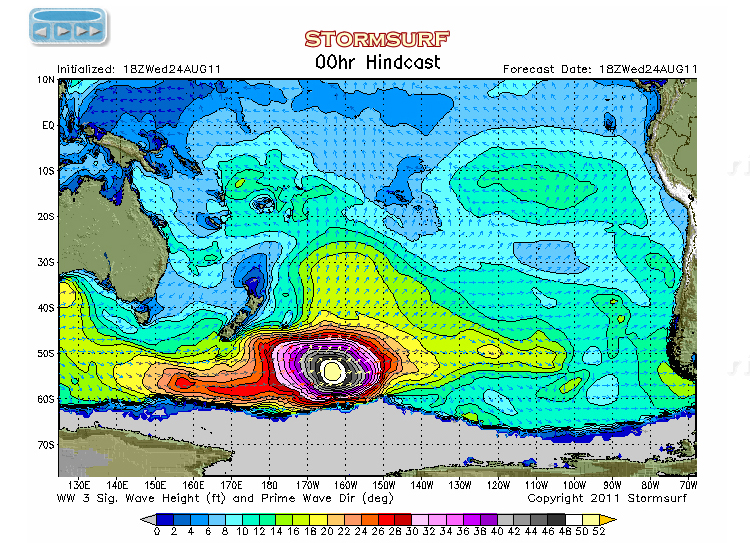In the 1950’s and 60’s, Dr. Walter Munk of the Scripps Institute of Oceanography studied the propagation of swell energy originating in the South Pacific Ocean across the whole of the Pacific Basin. His team discovered that a large storm near Antarctica will create swell energy that eventually reaches the shores of Alaska. This research was vital to our understanding of how swells travel. Now we hope for strong activity in the Roaring Forties. We anxiously watch swell models, hoping for purple blobs to grow and spread across the Southern Ocean.