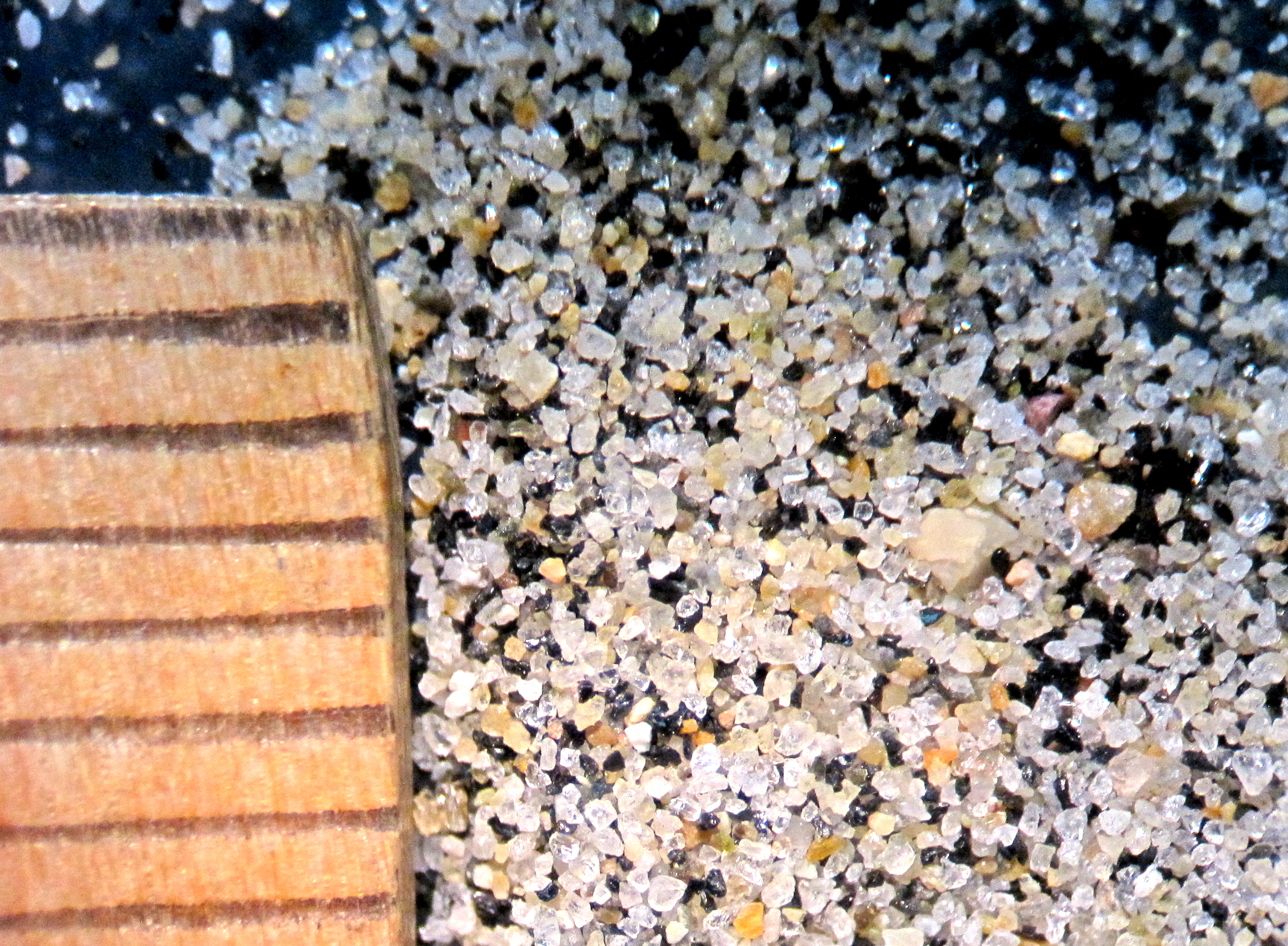 In geologic terms, “sand” refers to a certain size of particle in sediment: smaller than gravel and larger than silt. A sand particle measures between 1/16mm and 2mm in diameter. The main mineral components of beach sand include: quartz, feldspar and hornblende. All three are silicate minerals. These minerals, with their different combinations of silicon and oxygen, make up 90% of the Earth’s crust.