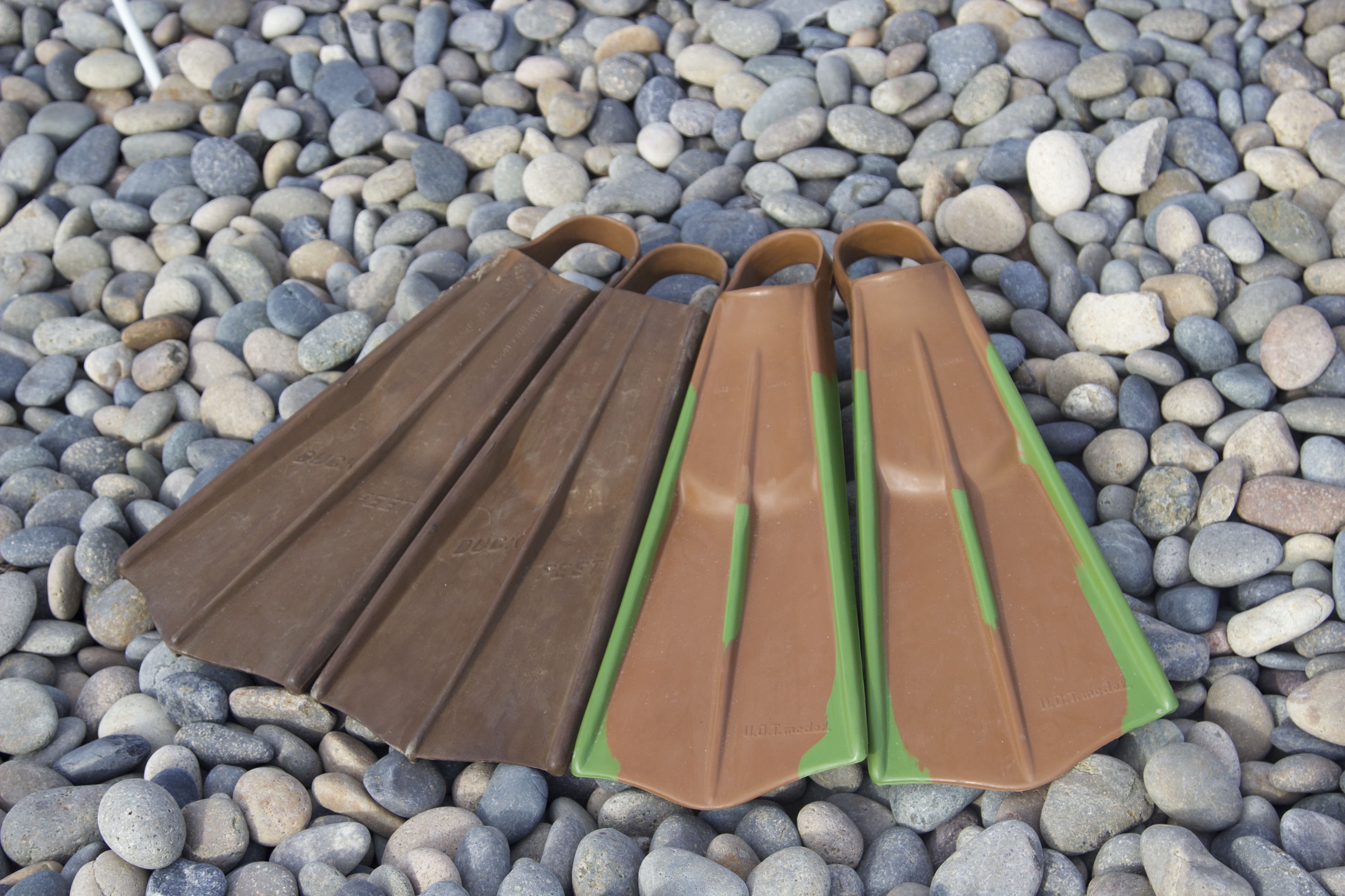 -Developed for military use in the 1940s, resurrected in the 1980’s and going strong today. There is a dedicated crew of older riders that will wear nothing else. UDTs are recognizable by their 10inch blade, the longest available for a bodysurf fin. They are very powerful but it takes a little while to get used to the different, longer stroke it requires to get them really moving. UDTs excel when gaining momentum to take off early. I found the brown gum rubber UDTs buried in the back of an antique dealer’s truck in Ocean Beach, SD. I asked him if he had any vintage fins and he pulled these out…exactly the kind of thing I was looking for. The green and brown UDTs are the modern reincarnation developed by Greg Deets.
