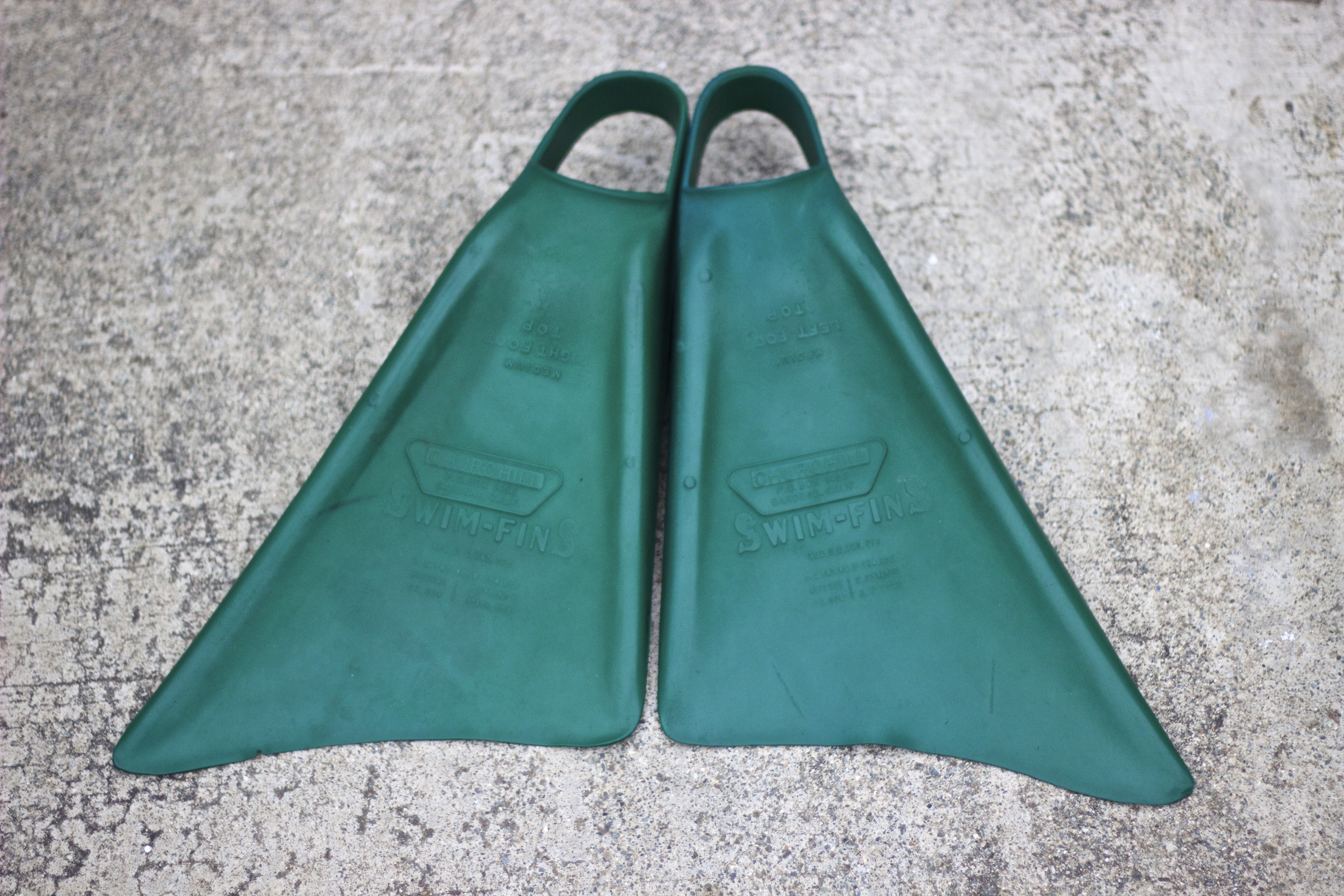 -Created during the post-war recreation boom of the late 1940s, these are the second generation Churchill. Unique because they float and they are the first swim fin with color. They are made of the softest rubber compound of any fin I’ve felt. It is difficult to believe that they could even provide much thrust, but I suppose when the only other option was your barefeet, they were relatively powerful. I purchased these on Ebay. A pair of “Greens” show up occasionally and the price varies on who is selling them and who is looking for them at the time.