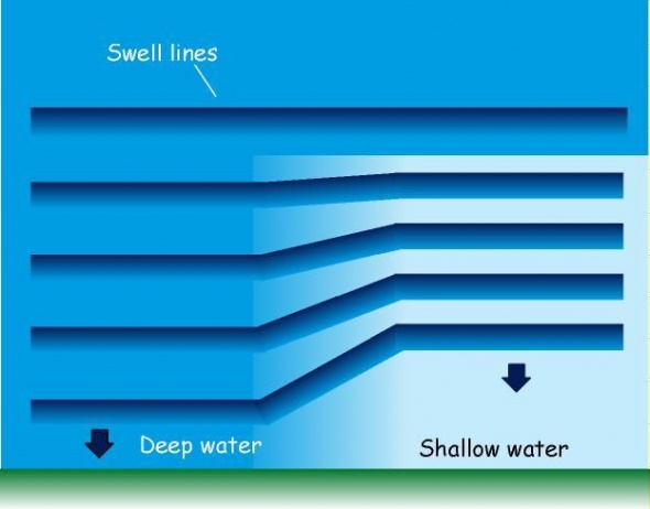Swell approaching a coastline will always refract and bend toward shallow water. Reefs, sandbars, points and submarine canyons cause swell energy to focus and shoal. Because there is a variety of depths along a coast, waves break differently everywhere. Sandbars frequently shift and move as the sand is carried by longshore currents. California reefs are uplifted remnants of the coastal bluffs and marine terraces. Points are created by the uneven shape of a dynamic coast. Submarine canyons form when fresh water runs off the land and erodes a chasm in the continental shelf.