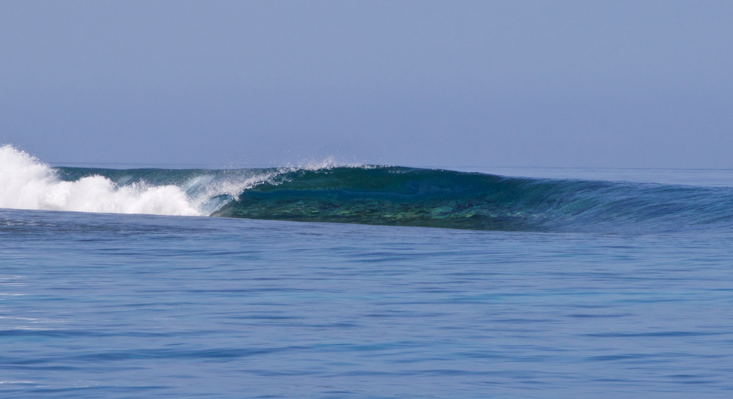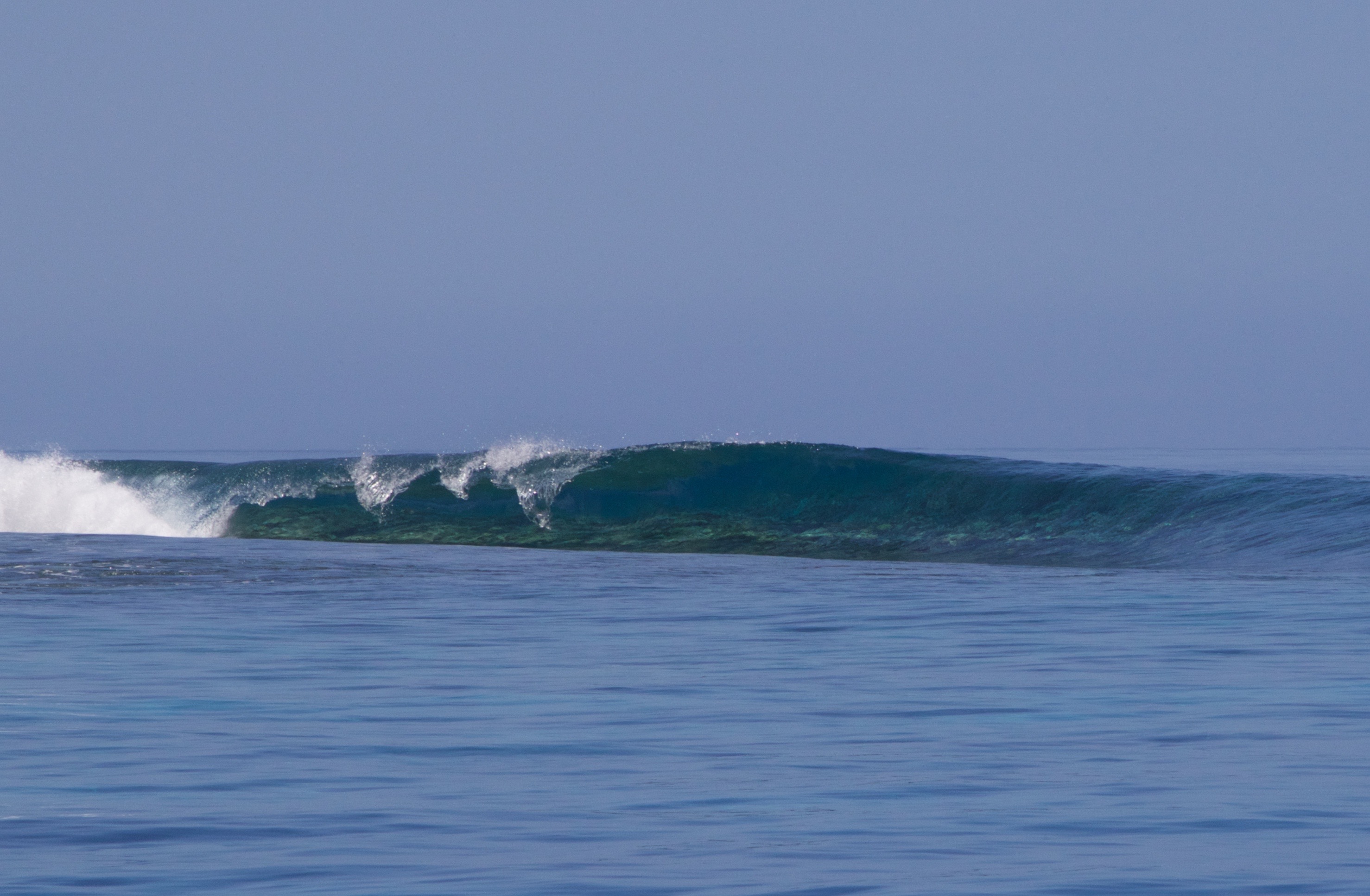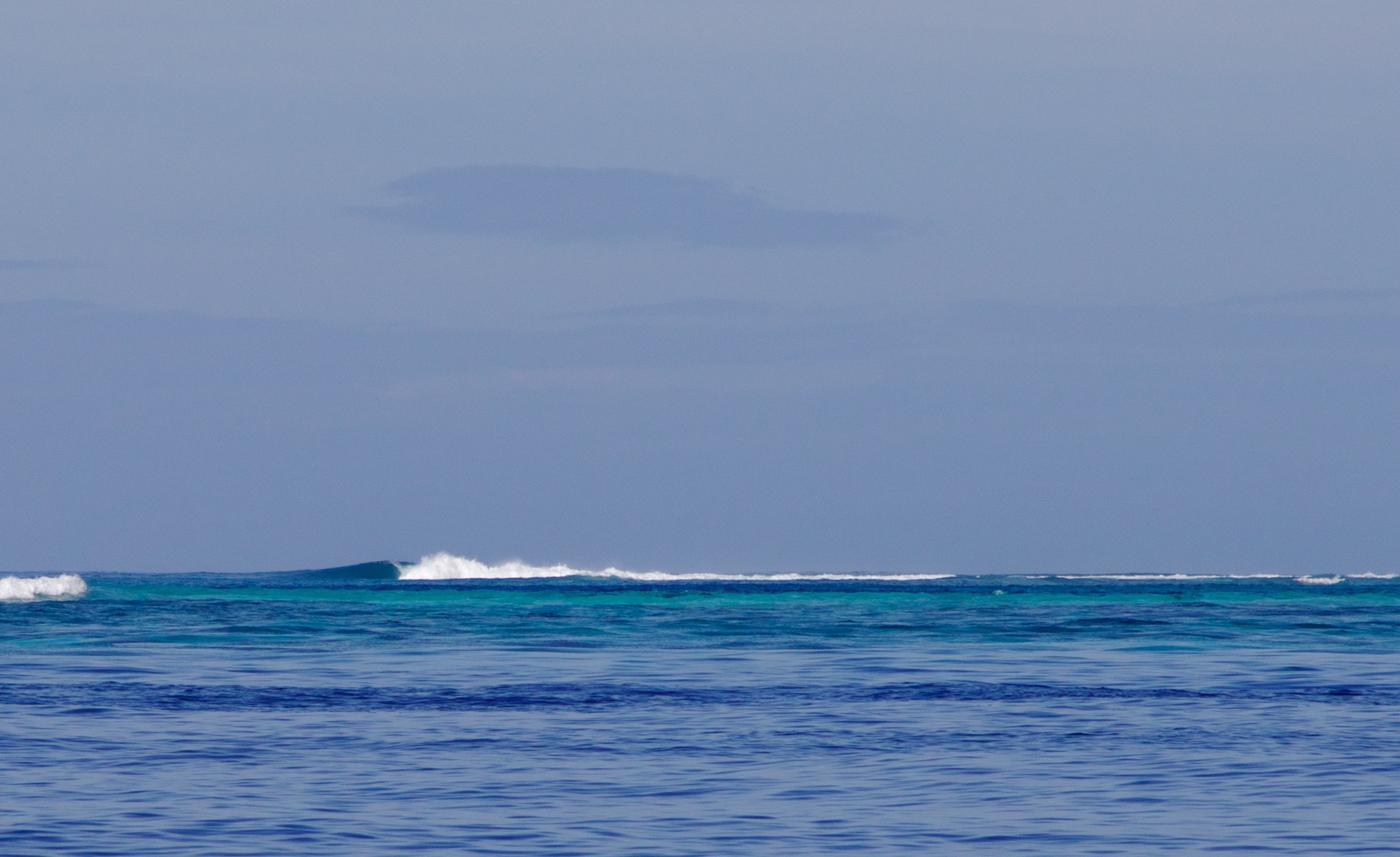On another boat trip across Somosomo Straight to Taveuni, I could see white water on the horizon. As I watched, I began making out the shape of a wave. A perfect looking A-frame with a fast, hollow left and a roping right. It was breaking in the middle of the Straight near Rainbow Reef. I was at least a mile away. The waves must’ve been well overhead. I was mesmerized. I excitedly snapped a few dozen photos and had the whole group watching intently.