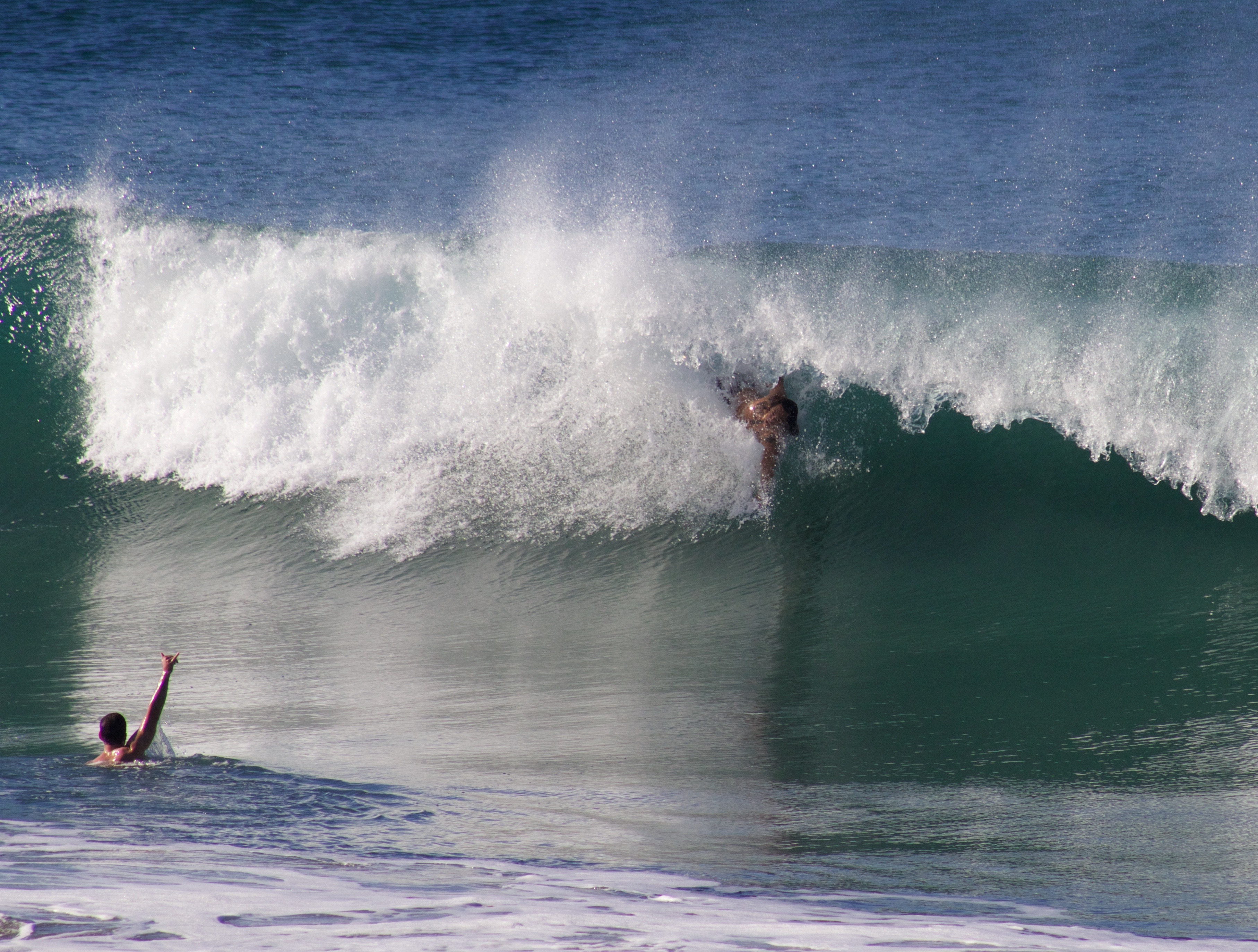 The next best thing to being in the barrel is watching your buddy slide into a big round one. Spectating a great wave from the water is almost as good as riding one. Bodysurfers have a unique point of view. We’re not worried about duck-diving a board under incoming waves. We wait until the final instant to swim under, maximizing our view as the wave throws over our head. Sometimes, we even watch our buddy too long and take a heavy lip right to the skull…but worth it for the view.