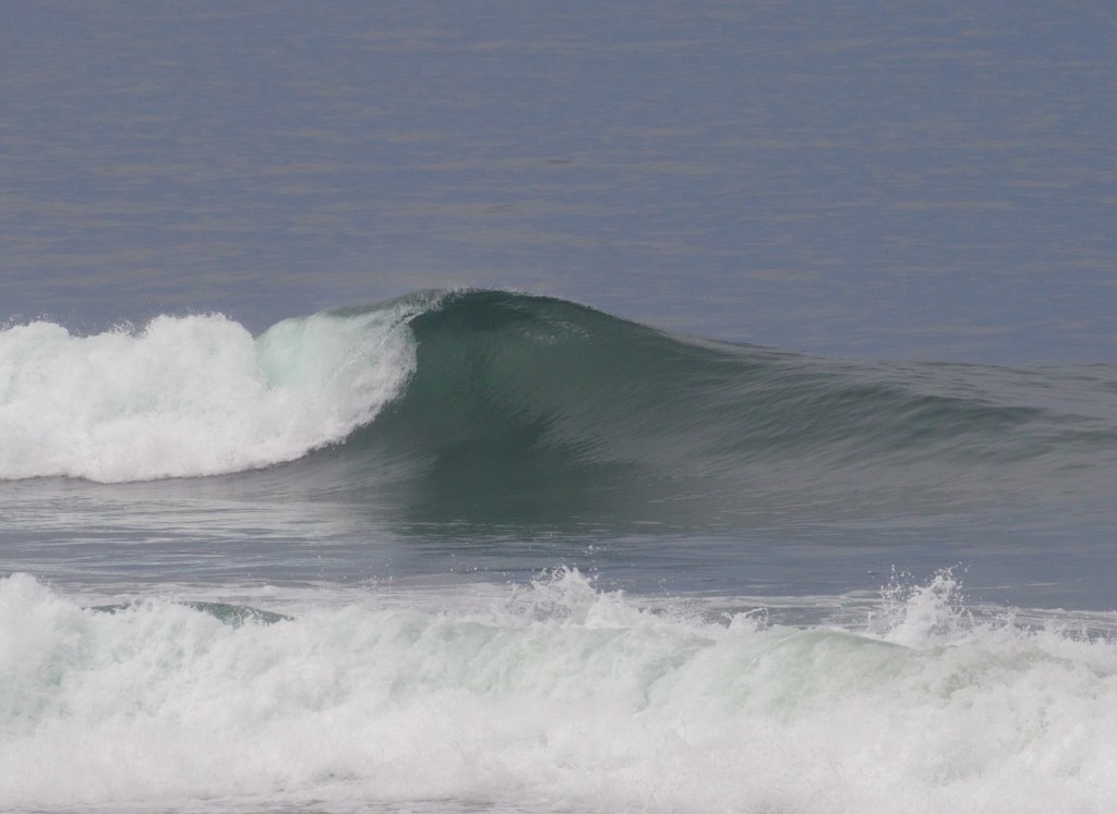 Suited, we walked down the cobblestone street as light poured through the old archway. Yeah, it was cold. June ice cream headaches with stunned fingers and toes. But the bending bowls! Oh those bending bowls. A reinforcing south swell was joined by a touch of NW windswell to provide hollow rides all along. We warmed a bit chasing the peaks in out of fleeting rip currents as a thickening fog swallowed the coastline. Wind picked up side offshore and we departed, heading south. A vibrant fogbow illuminated the beach as we meandered south again.