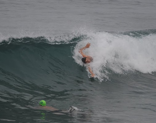 Unidentified rider laying it back in the pocket. The conditions exceeded forecasts for the early morning heats. Consistent and glassy stomach high waves allowed competitors to stretch out and show out on the open face. However, with a rising tide and increasing wind into the afternoon, conditions became more challenging. All competitors did what they…